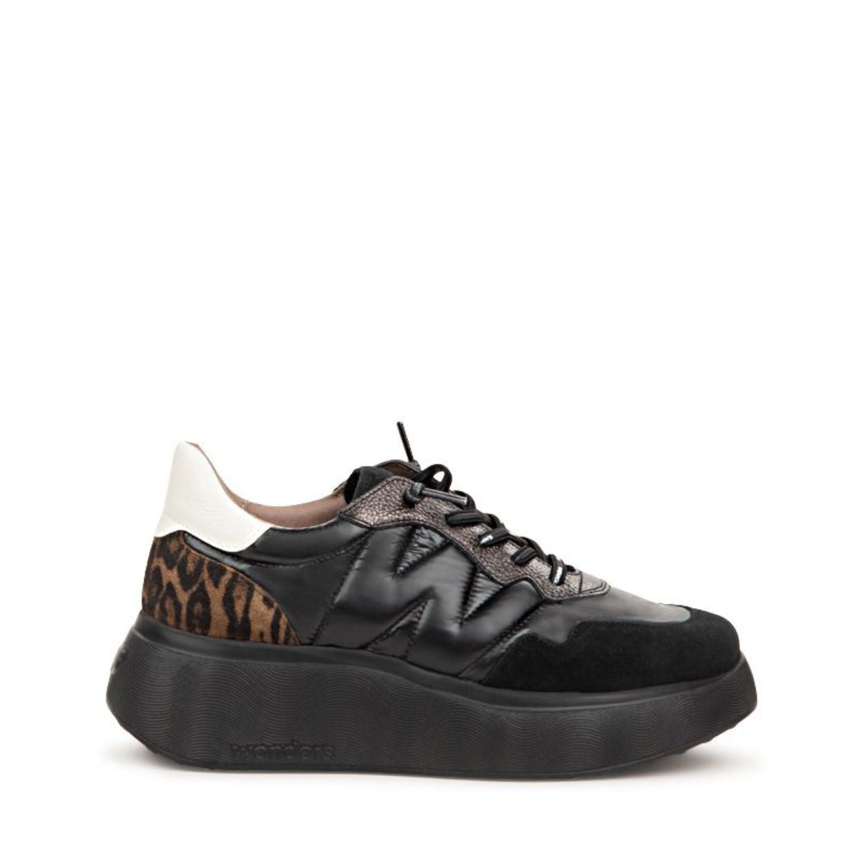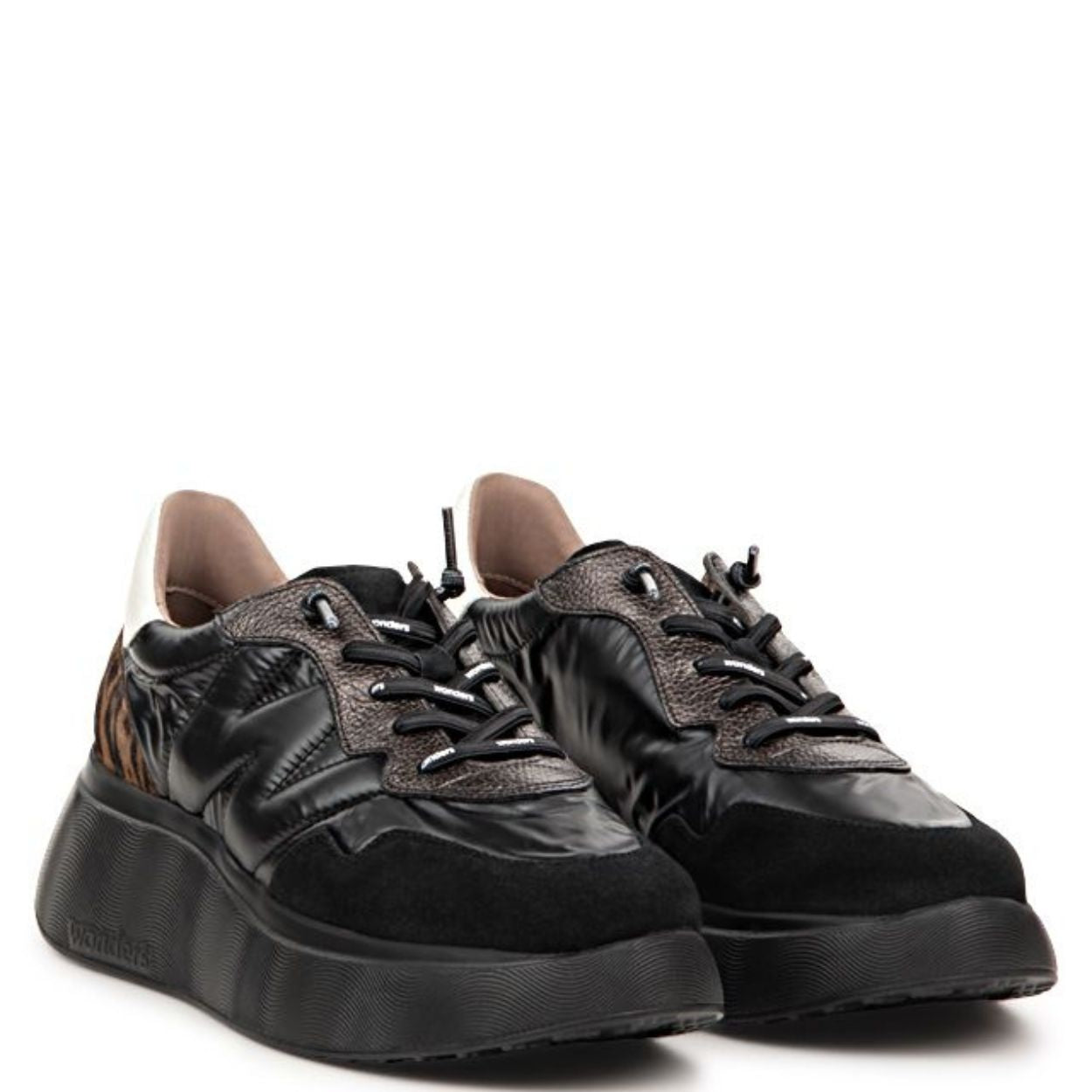 Bold style and lightweight comfort! This platform sneaker from Wonders platform sneaker combines contemporary allure with refined details. Crafted in metallic nylon, suede and leather, it seduces with its play of materials and animal touch at the back, giving it a unique personality. Elastic laces add a modern, practical touch, making them easy to put on every day. An extra-lightweight rubber wedge sole and removable memory leather insole ensure lasting comfort. A model that enhances your outfits with modernity and originality.