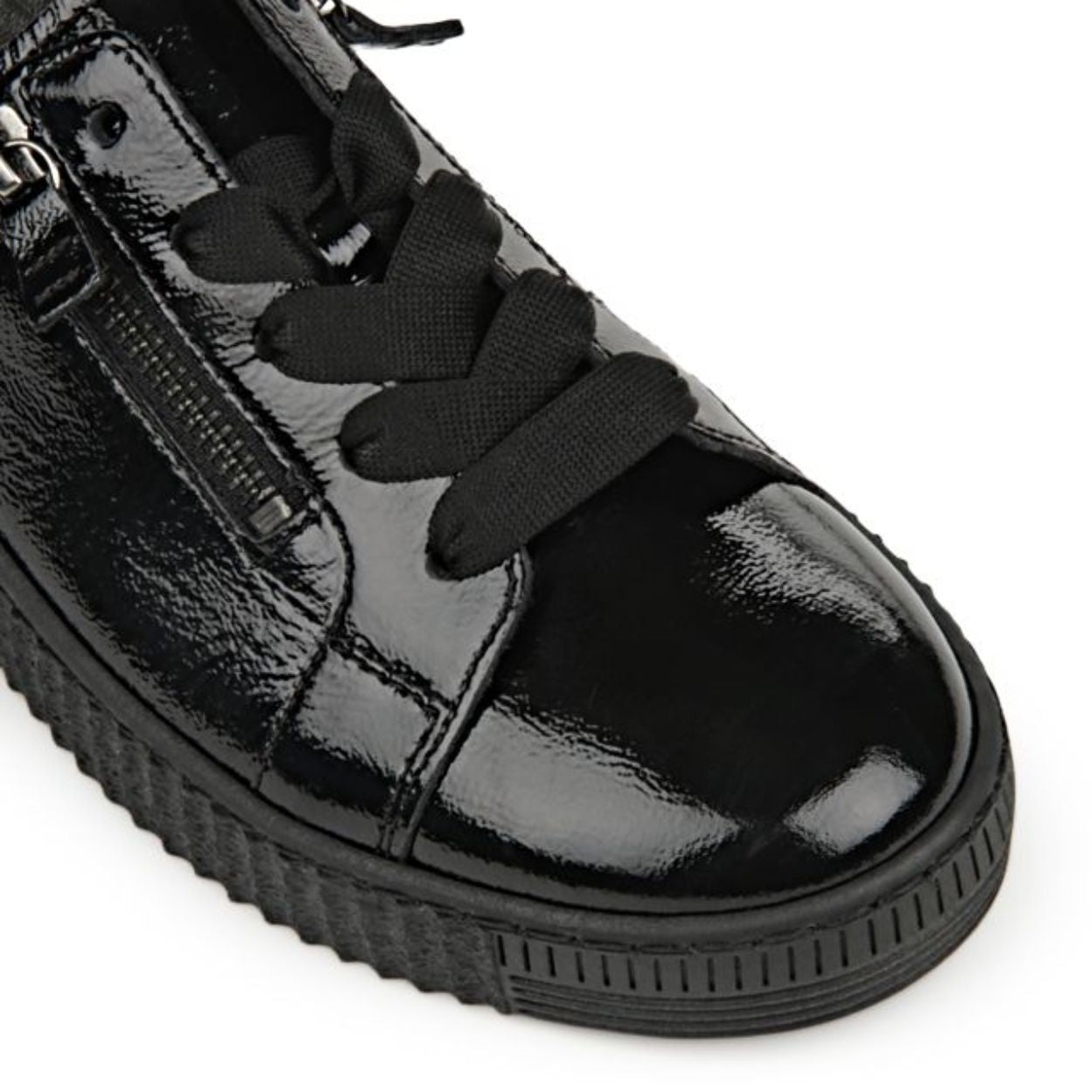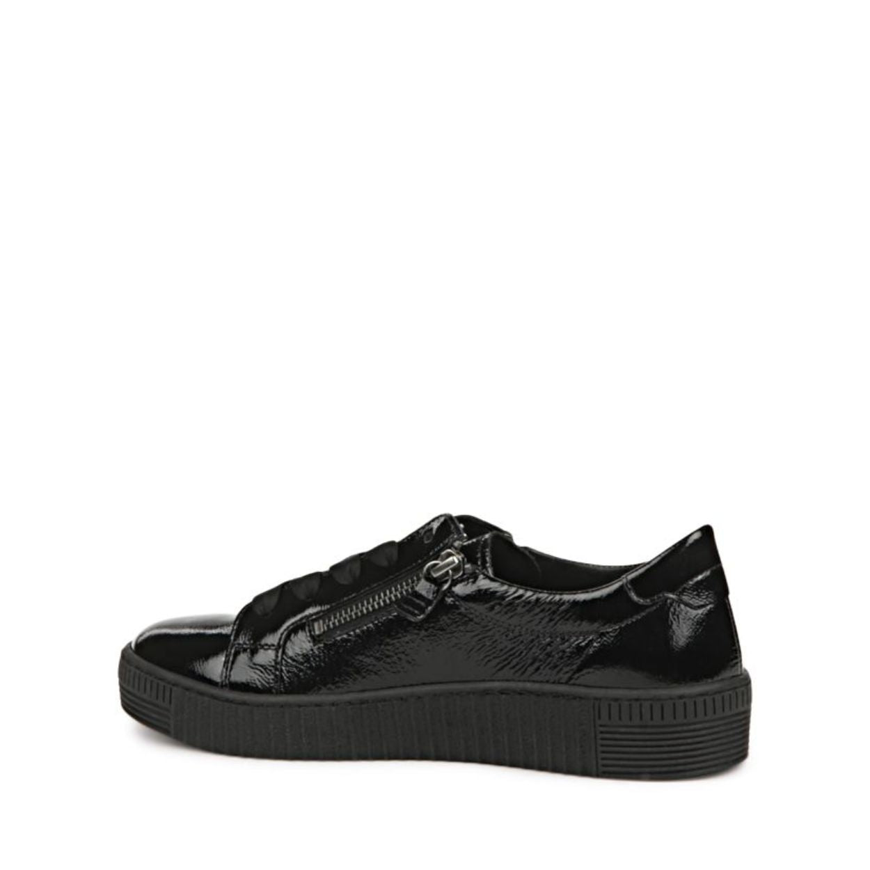Brilliant elegance and discreet comfort! Gabor's patent shoe embodies effortless chic. Crafted in black patent leather, it seduces with its refined allure and lustrous finish. The flat ribbon lace gives it a feminine touch, while the side zips make it easy to put on every day. Its lightweight synthetic sole and removable leather insole make it as practical as it is stylish. Perfect for enhancing your everyday outfits with modern flair.