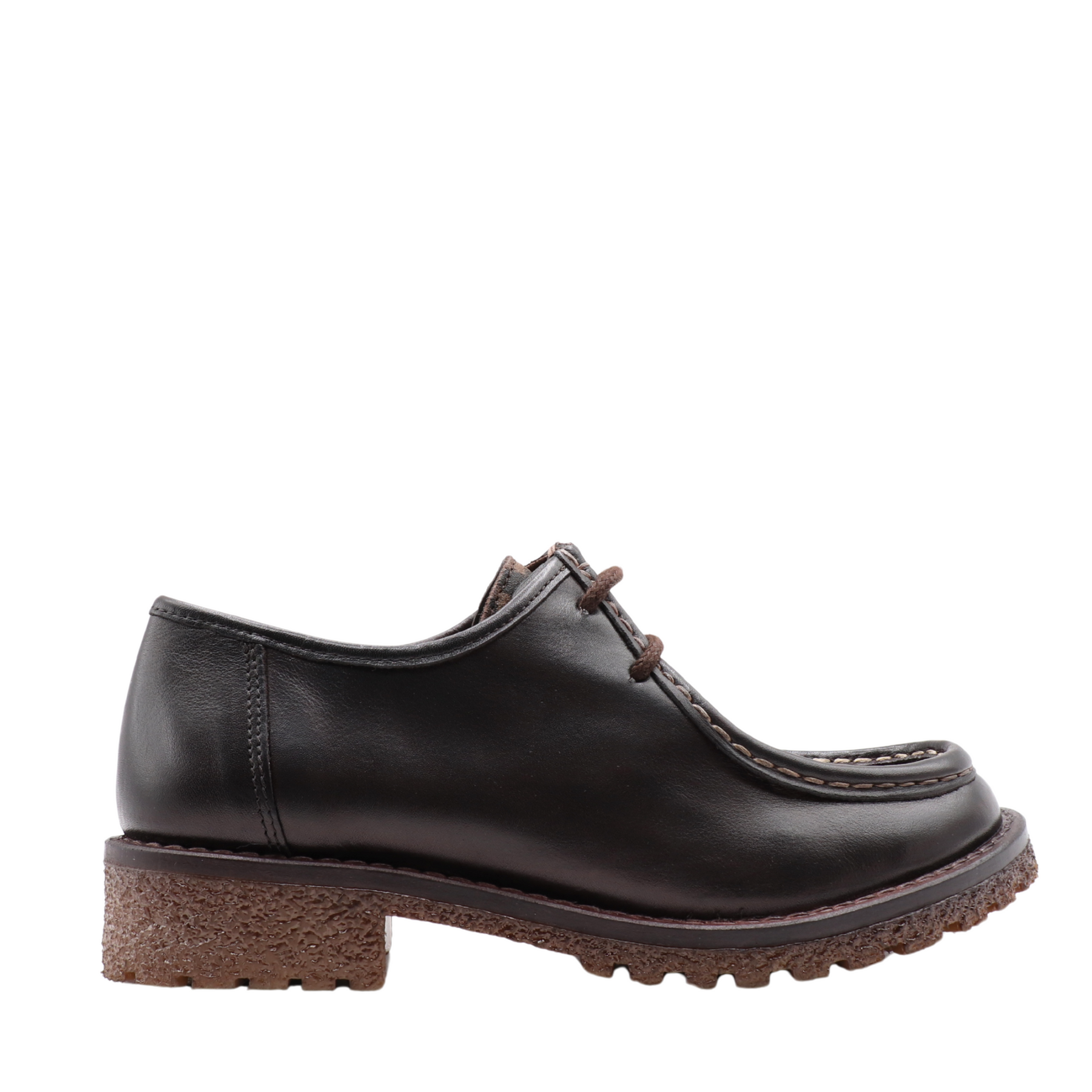 Apropo 's Freya combines character and comfort in an iconic silhouette. Made in Portugal from genuine leather, this lace-up shoe features a contrasting animal print upper - leopard for the brown version and zebra for the black. Its bold, artisanal styling, with exposed stitching and sturdy crepe sole, makes it a perfect choice for those who want to stand out while enjoying lasting comfort.