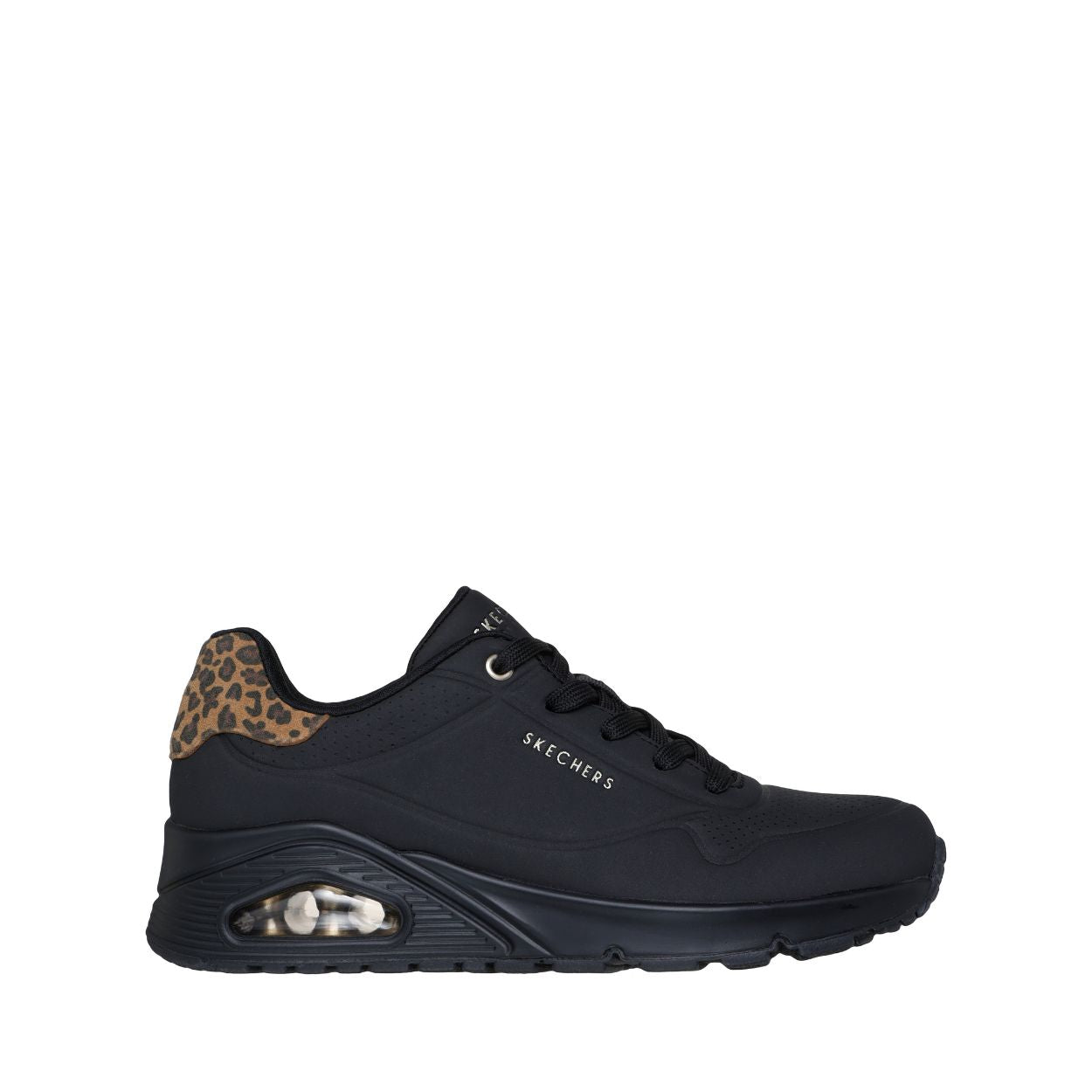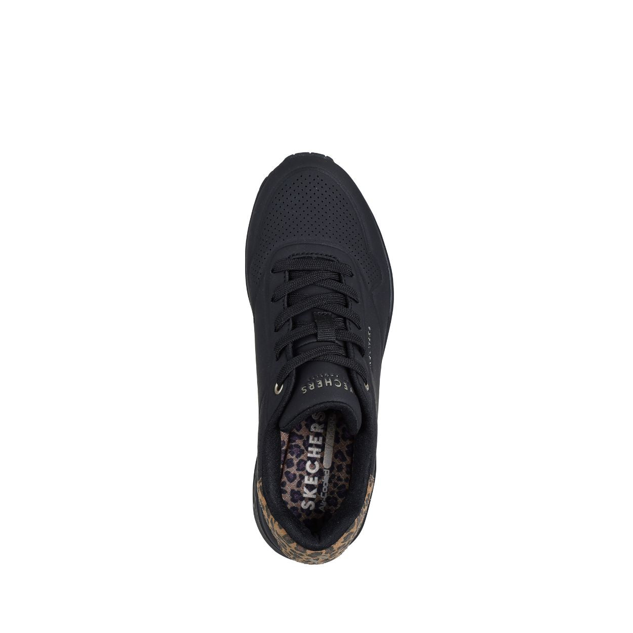 Walk on cloud nine with the wildly comfortable Skechers Street™ UNO - Jungle Nite. This lace-up fashion sneaker features a synthetic upper with leopard-print back yoke, a Skechers Air-Cooled Memory Foam® comfort footbed and a Skech-Air® midsole with visible air cushioning.