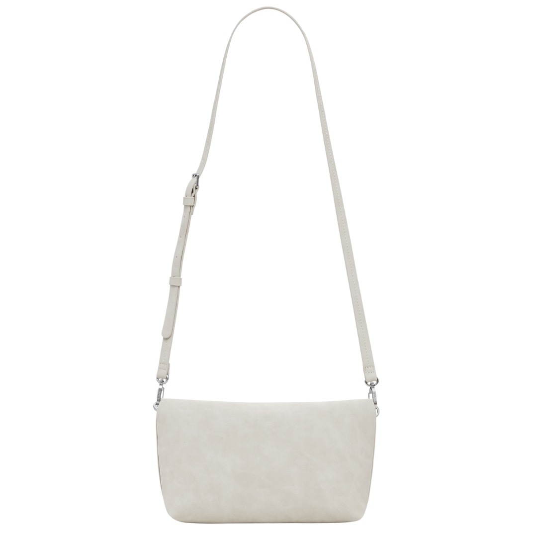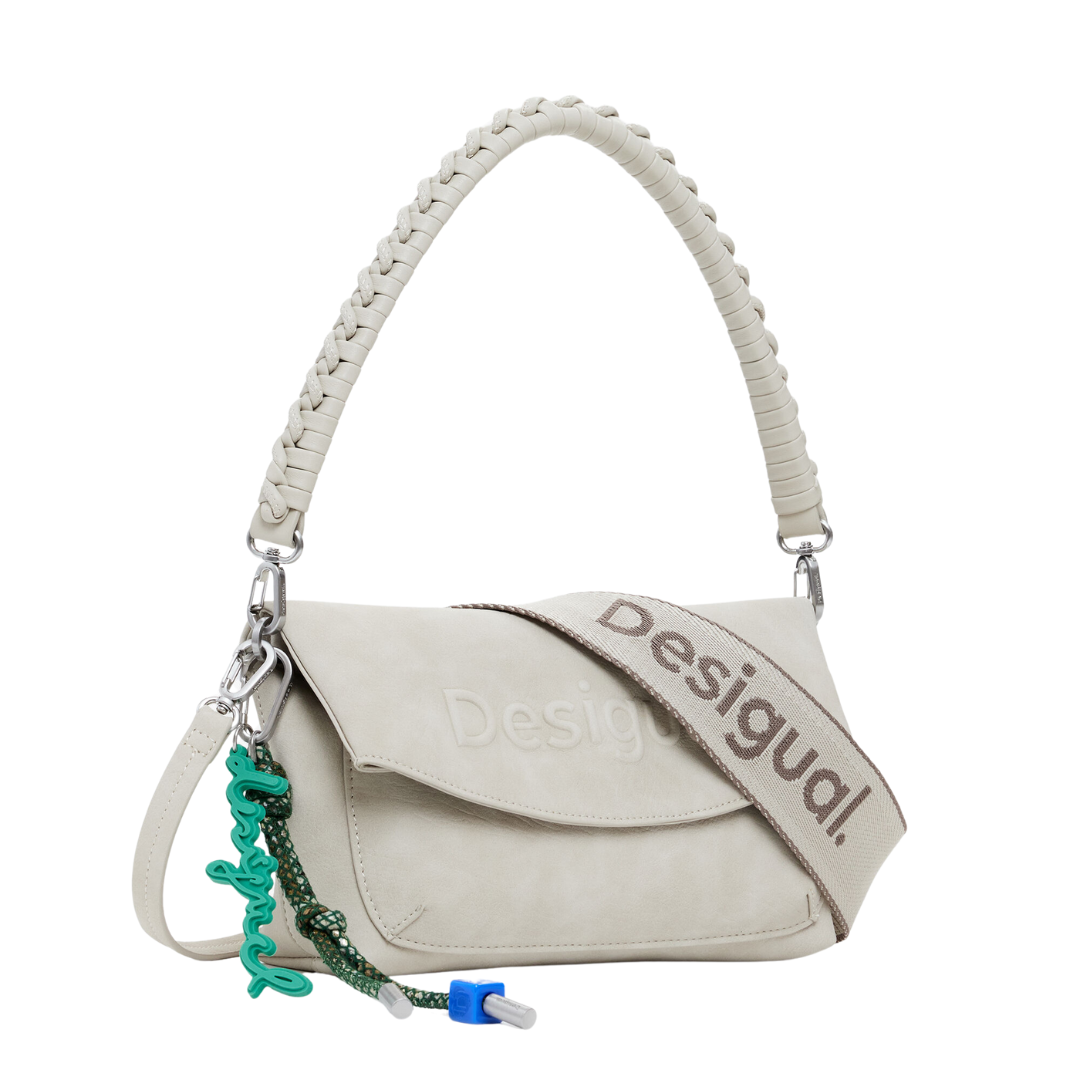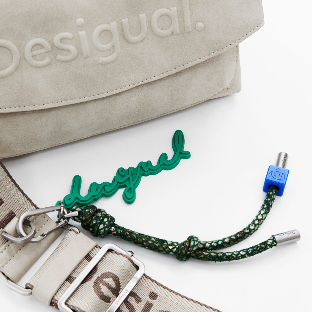Shoulder bag in leather-effect fabric, with 3D-effect logo, zipper, expandable flap, interchangeable handles and removable key ring in solid color.