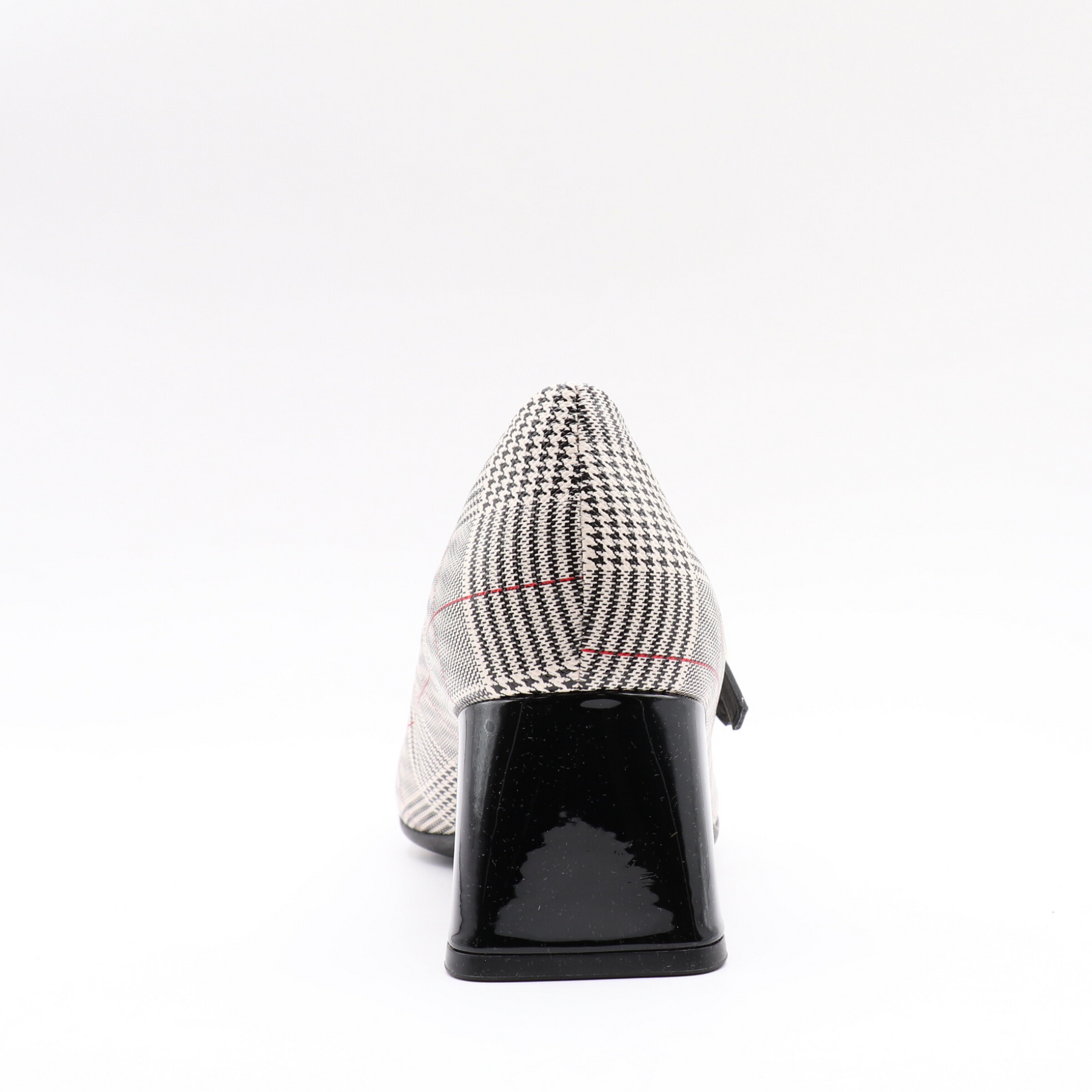A square-heeled shoe that revisits classic elegance with a modern twist. Made from synthetic material, it features a timeless tartan pattern, enhanced by a black patent toe and decorative straps with gold buckles. The block heel ensures comfort and stability, while providing a chic look for the office and out on the town.