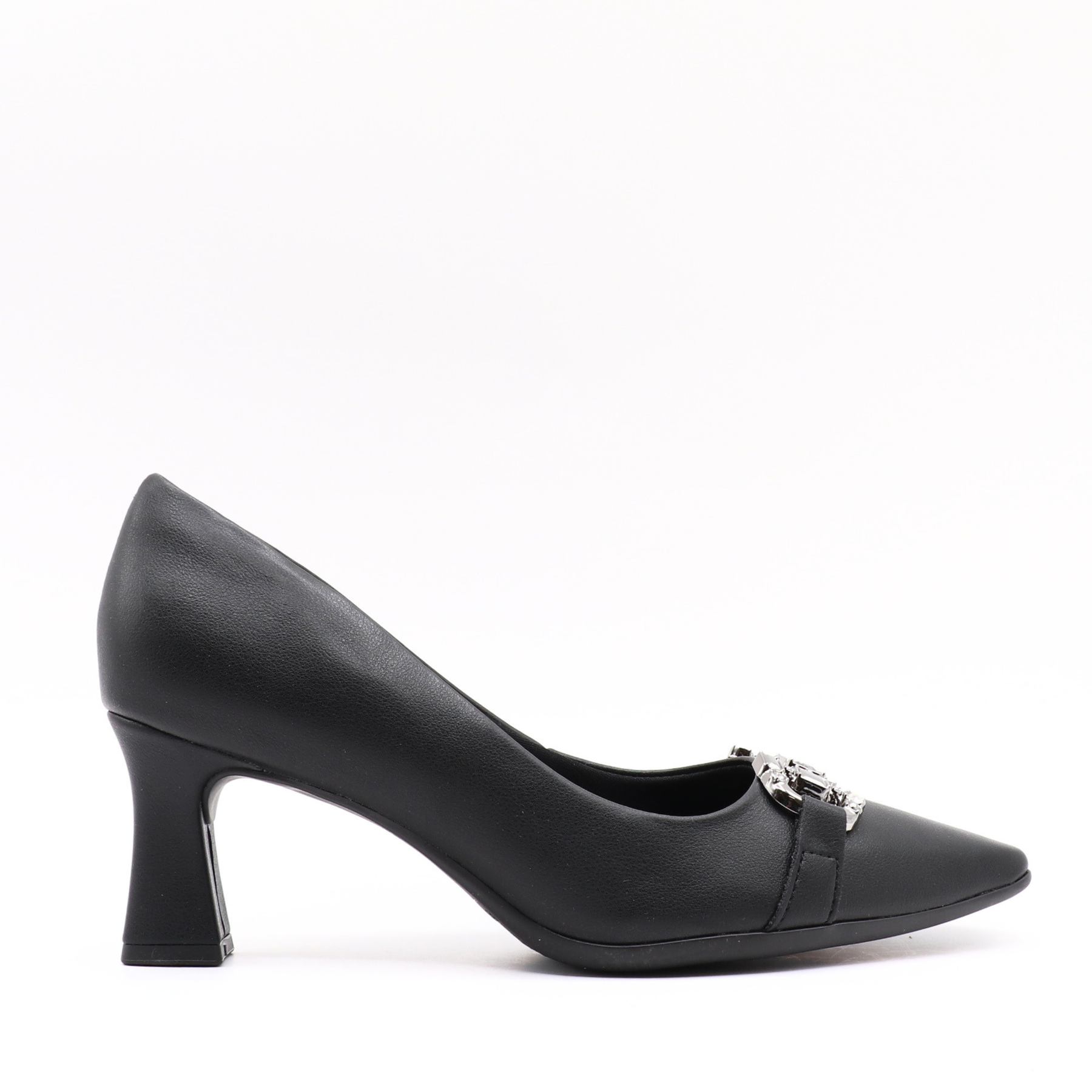 A refined pump that combines elegance and comfort. Made of synthetic material, it features a pointed toe and sophisticated metal embellishment at the front for a chic touch. Its slim, stable heel offers a sleek silhouette, perfect for special occasions as well as elegant professional wear.