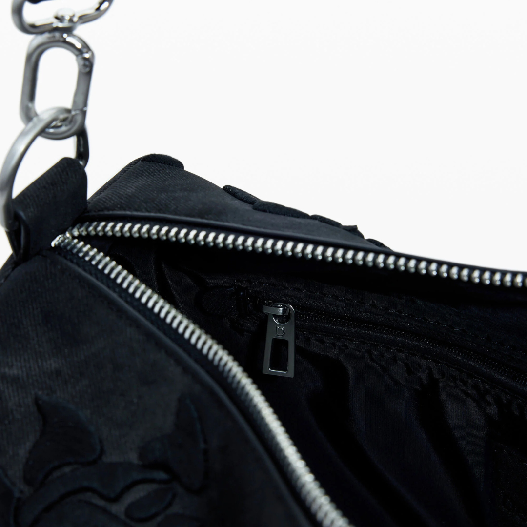Medium-sized handbag in plain imitation leather, with 3D relief engravings and zip fastening.