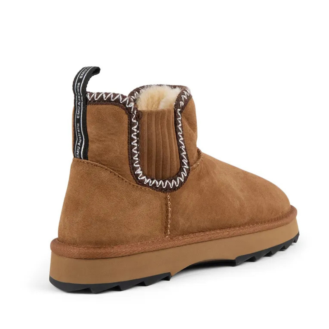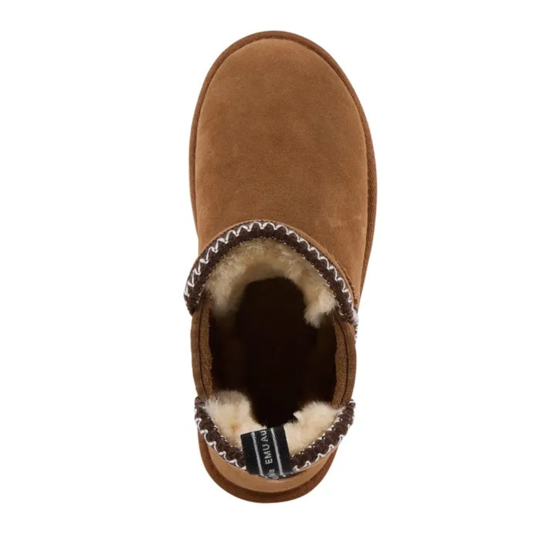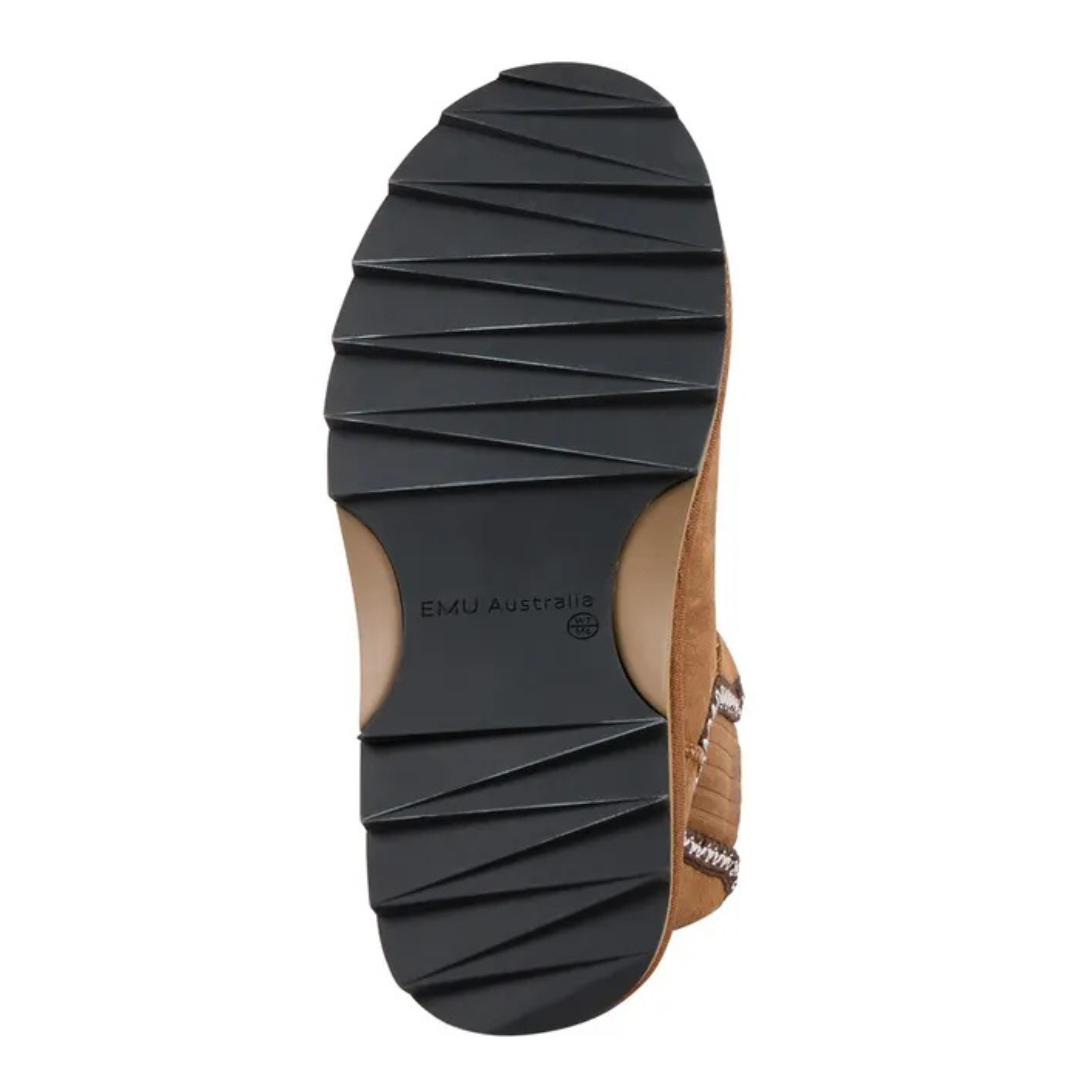 Don't let its size fool you: this little boot has all the makings of a big one. With its Aztec-inspired embroidery, water-repellent Australian sheepskin and thick Sharky sole, it combines comfort, style and boldness. The micro cut adds a modern touch, the back tongue makes them easy to put on, and the whole look exudes EMU attitude. The result is a boot that's cozy, durable and full of character.