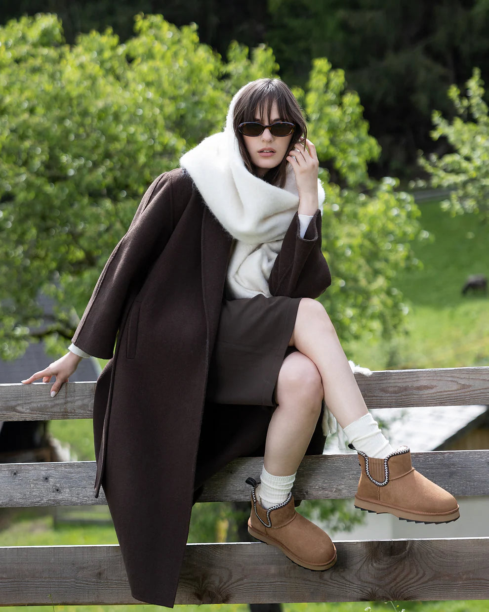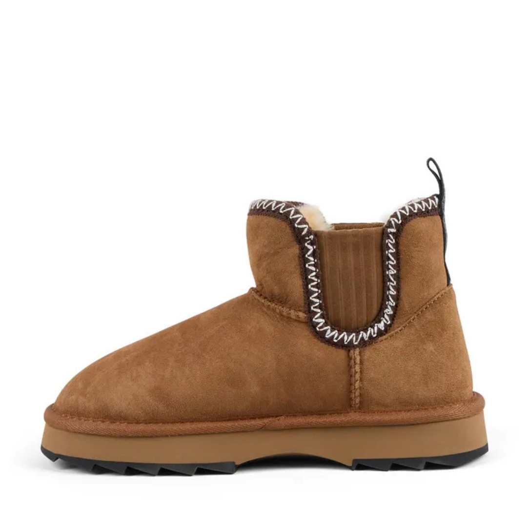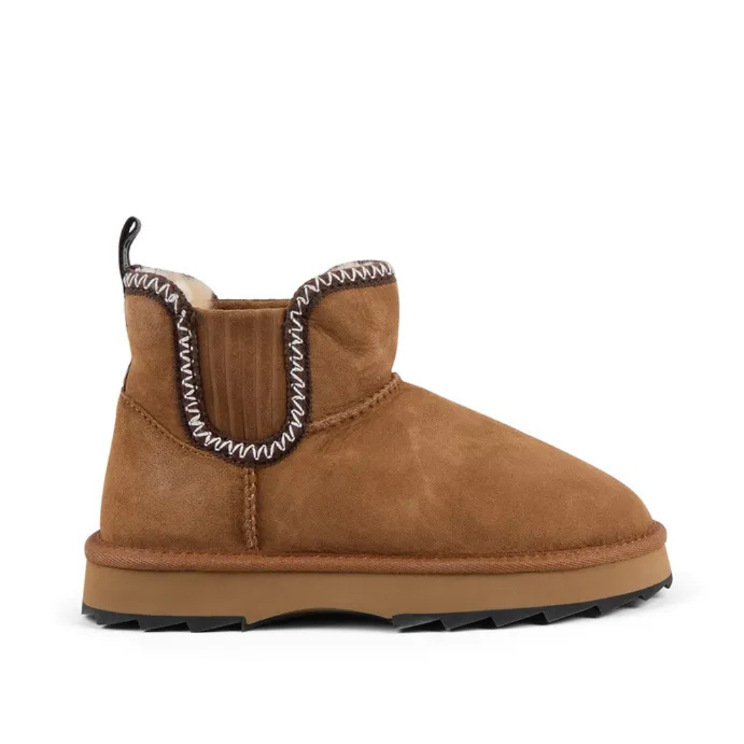 Don't let its size fool you: this little boot has all the makings of a big one. With its Aztec-inspired embroidery, water-repellent Australian sheepskin and thick Sharky sole, it combines comfort, style and boldness. The micro cut adds a modern touch, the back tongue makes them easy to put on, and the whole look exudes EMU attitude. The result is a boot that's cozy, durable and full of character.