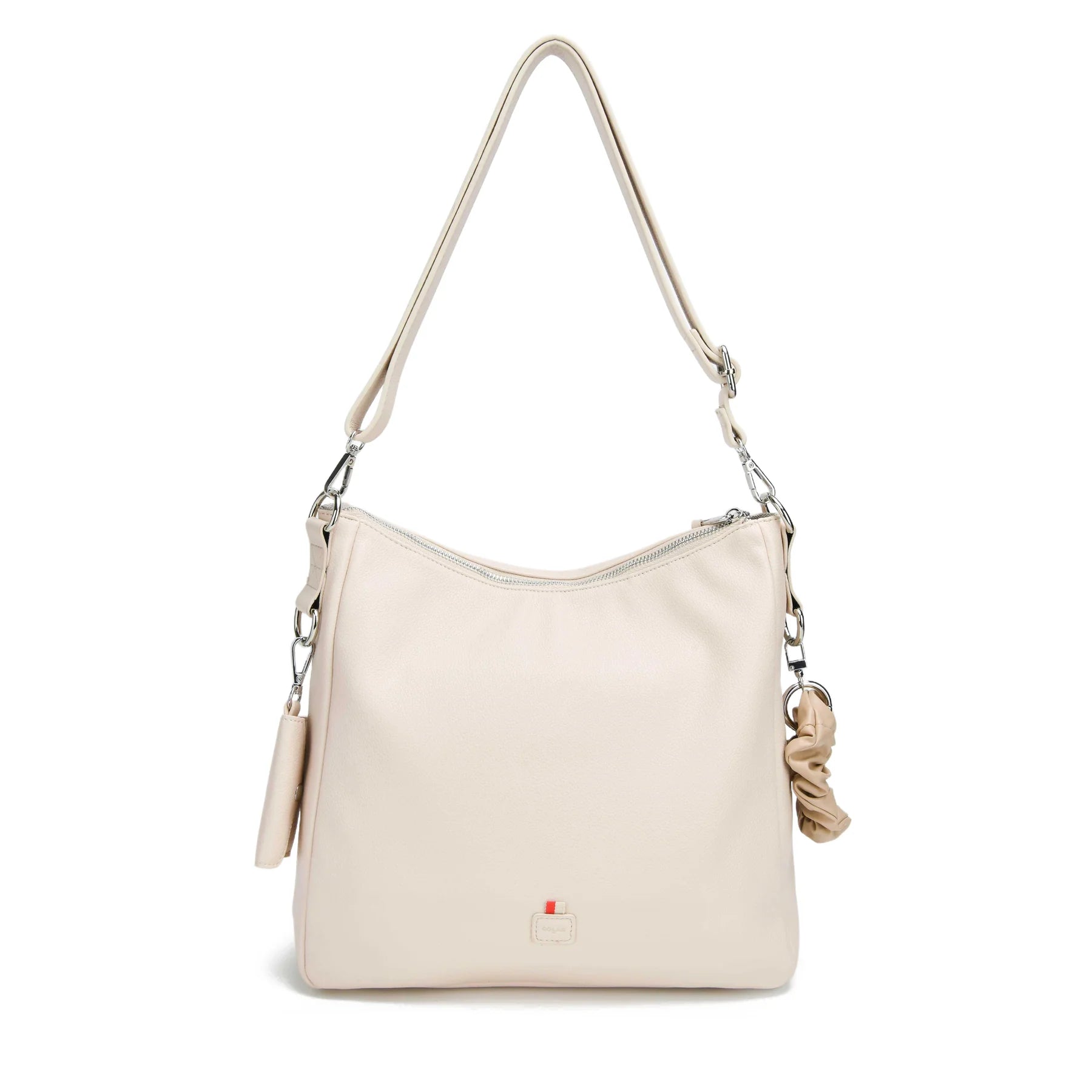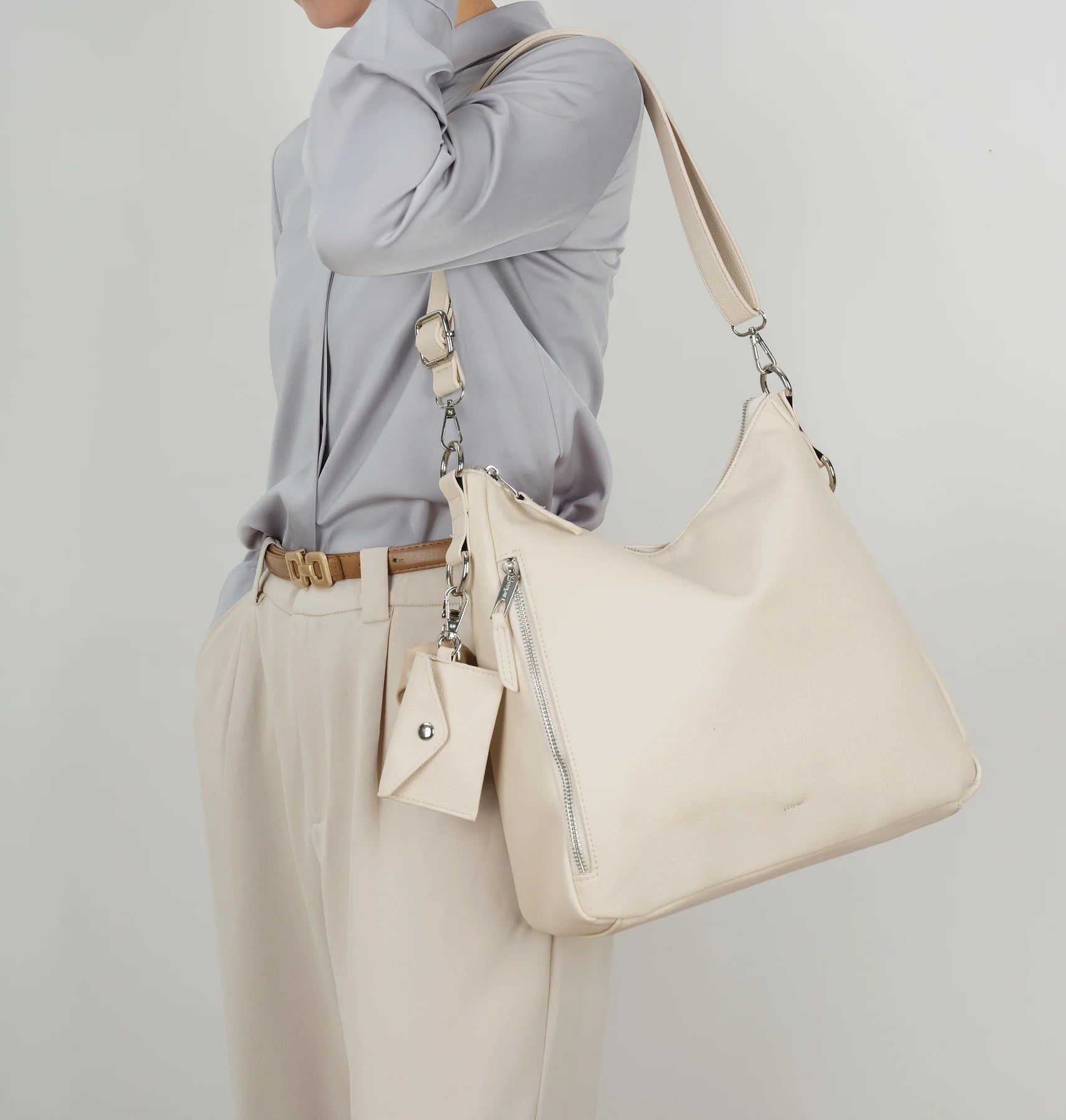 This spacious handbag features a long, adjustable shoulder strap, offering the option of carrying it across the body. Its vegan leather scrunchie and suspended card holder give it a festive touch.