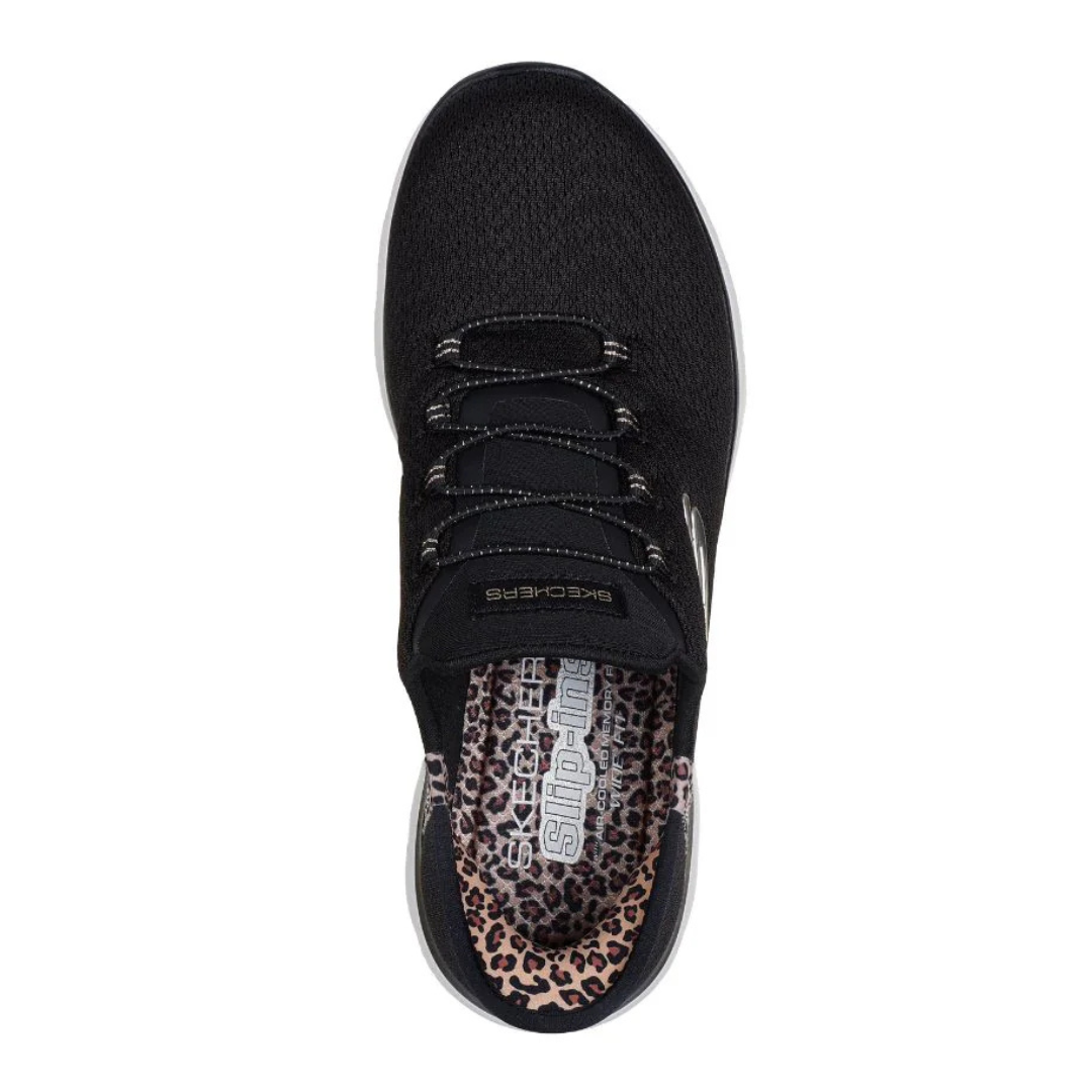 Add a touch of glamour to your step with the Skechers Slip-ins® : Summits - Leopard Chic, combining absolute comfort and effortless style. Designed with our Heel Pillow®, this vegan model features a mesh upper with leopard trim, fixed stretch laces and a comfortable Skechers Air-Cooled Memory Foam® footbed.