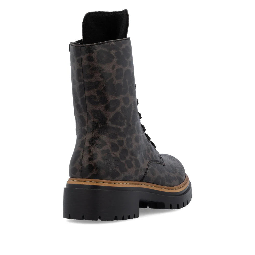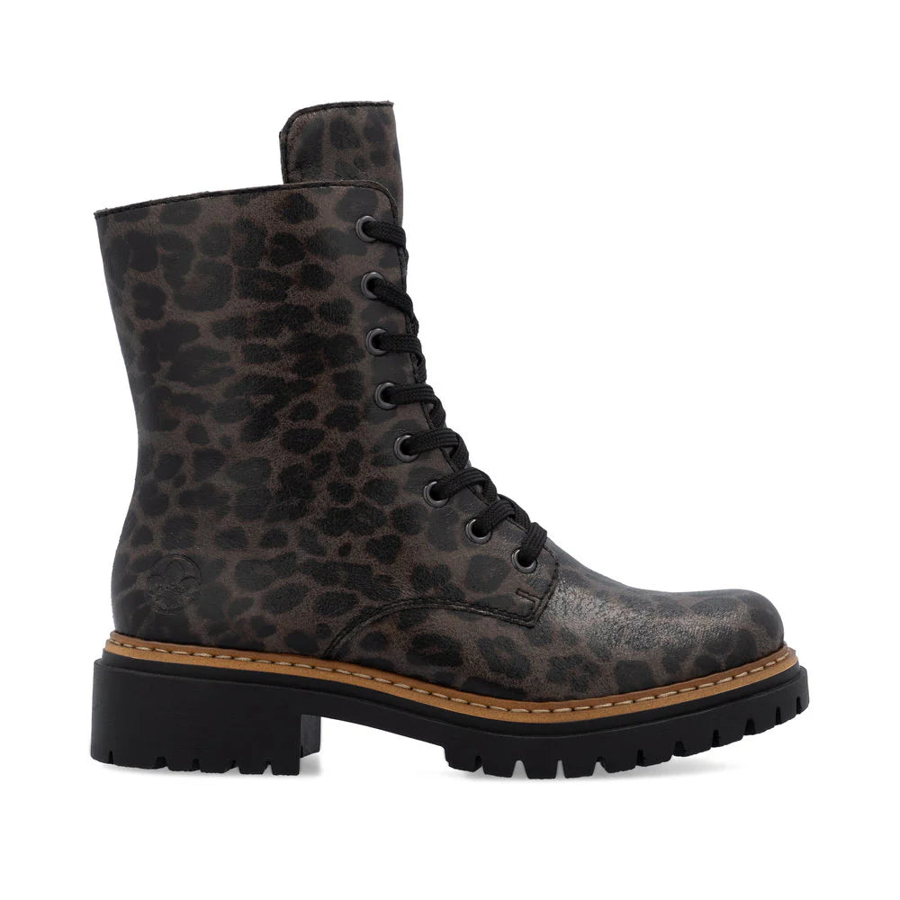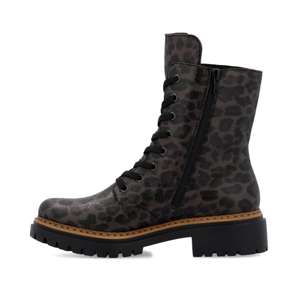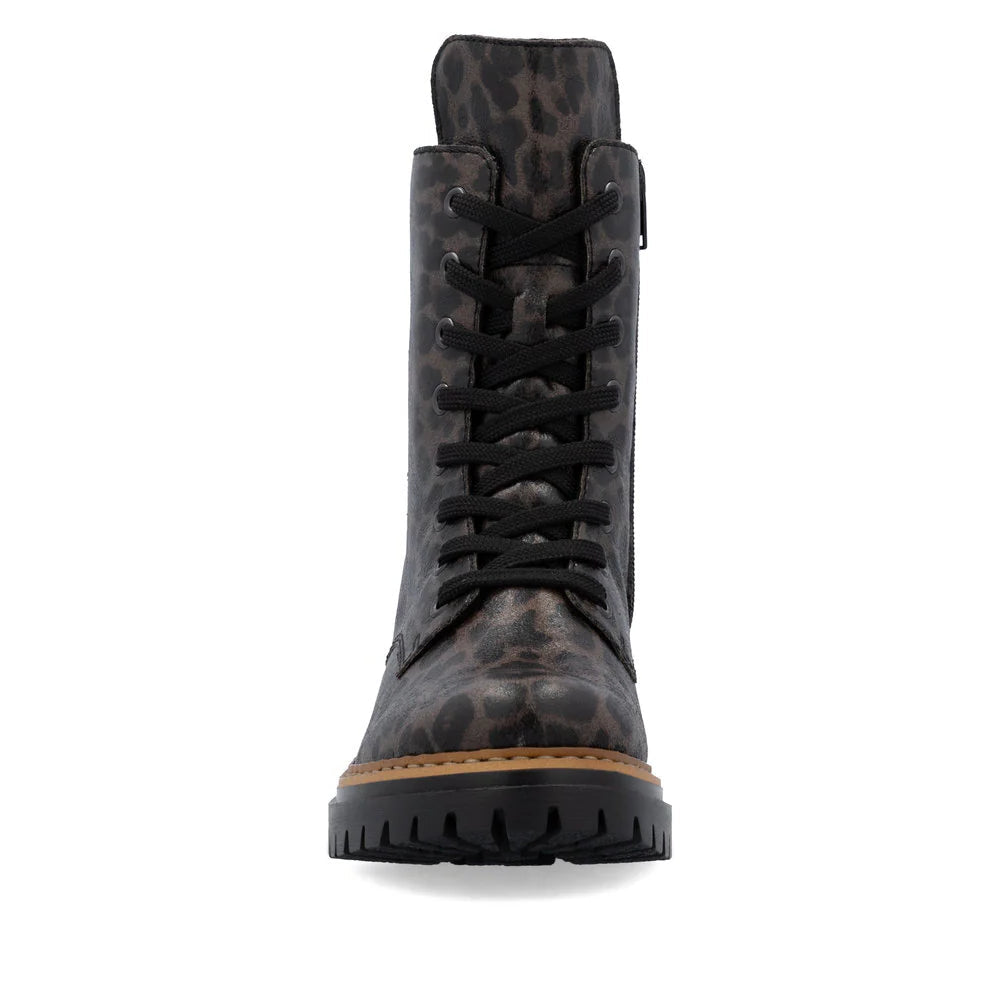 A real favorite! These black and brown Rieker biker boots are a comfortable companion. Made with stitched construction, they are sturdy, flexible and offer a perfect fit. Despite the lacing, the shoe closes easily thanks to the zipper. The leopard print adds a touch of originality. The lightweight, shock-absorbing sole offers double the comfort with every step. Another plus: the extra-soft sole. What more could you ask for!