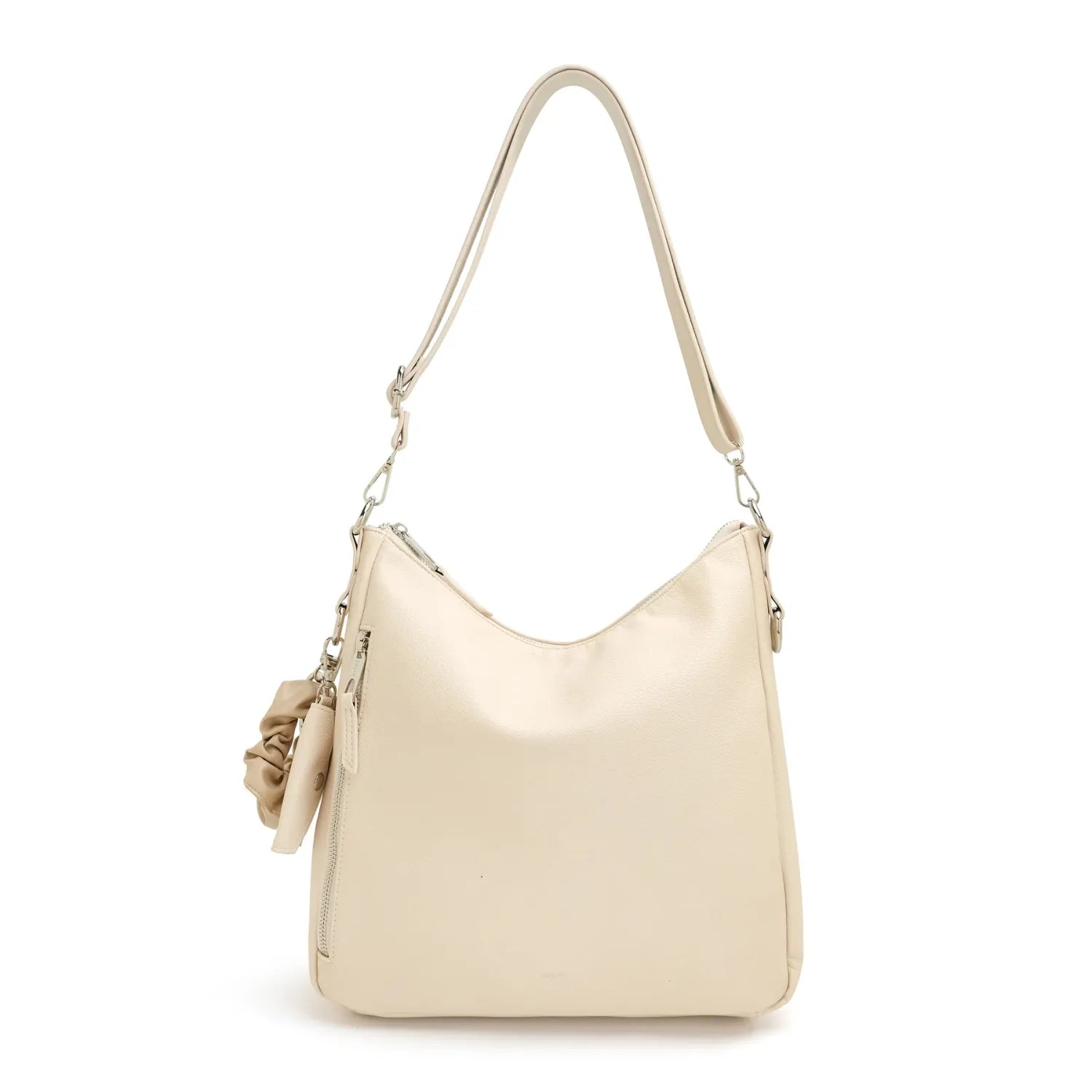 This spacious handbag features a long, adjustable shoulder strap, offering the option of carrying it across the body. Its vegan leather scrunchie and suspended card holder give it a festive touch.